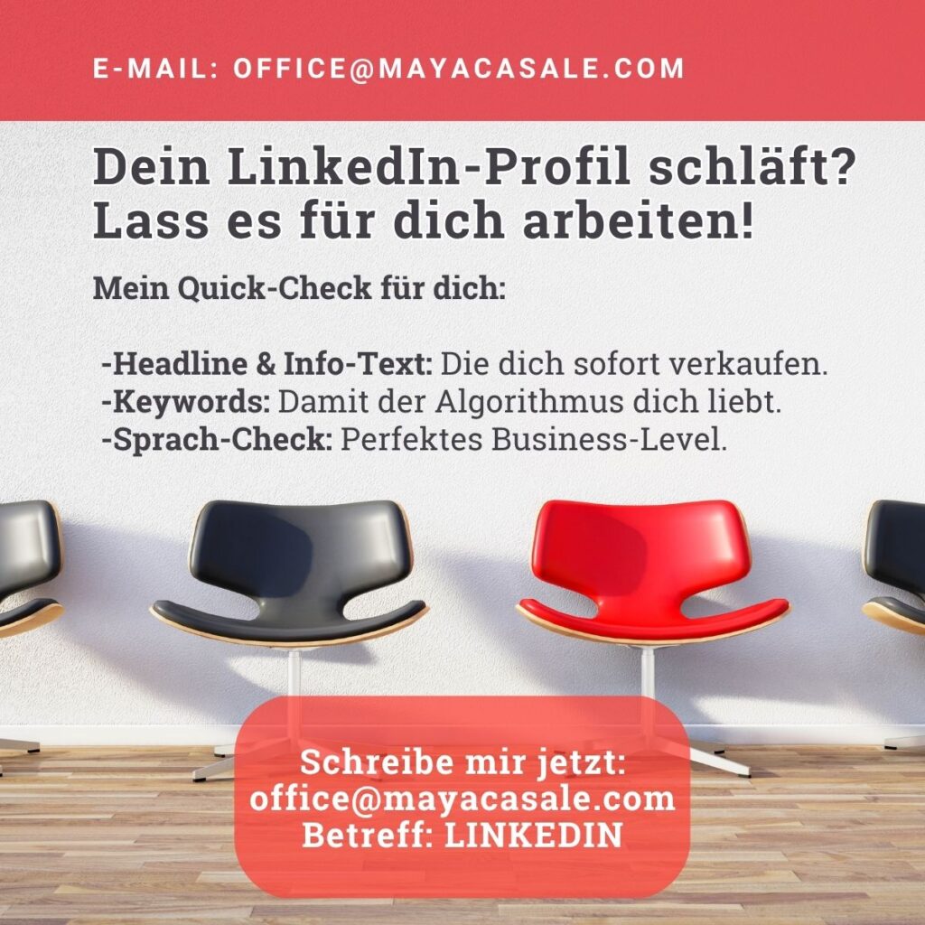 Dein LinkedIn-Profil schläft? Lass es für dich arbeiten! Recruiter, interessierte Firmen und potentielle Kunden suchen aktiv – aber finden sie dich auch? Ich mache dein Profil zum Magneten in: Deutsch, Englisch, Italienisch oder Spanisch. Mein Quick-Check für dich: -Headline & Info-Text: Die dich sofort verkaufen.-Keywords: Damit der Algorithmus dich liebt.-Sprach-Check: Perfektes Business-Level. So einfach geht’s:Du schickst mir deinen Link, ich sende dir fertige Textbausteine zum Kopieren & Einfügen in dein LinkedIn-Profil. Schnell, unkompliziert und zum fairen Preis! ALLES ONLINE UND UNKOMPLIZIERT! Schreib mir einfach „LINKEDIN-PROFIL“ als Nachricht für alle weiteren Infos: E-Mail: office@mayacasale.com